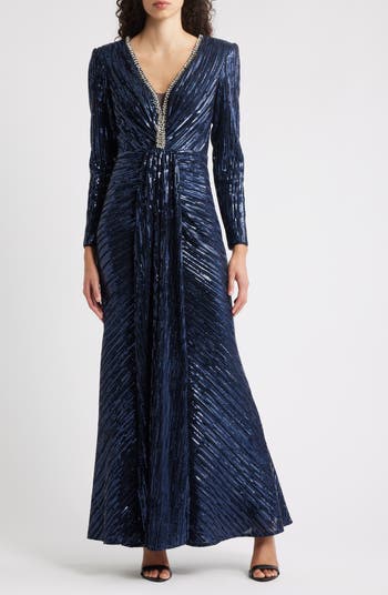 A sea of sparkle meets timeless elegance in this long-sleeve mermaid gown, featuring a deep V-neck and a figure-skimming design that’s practically made for grand entrances.