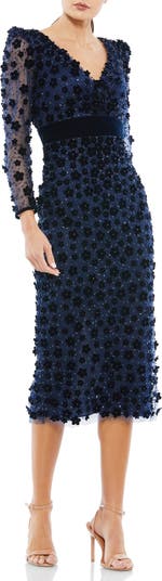 This midi dress features a flattering v-neckline and elegant long illusion sleeves. The embellished fabric adds glamour, ideal for formal events or special occasions.