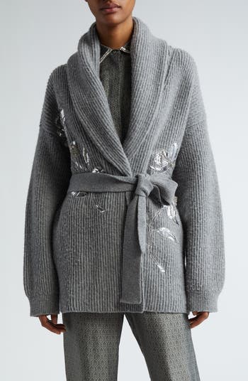 An assortment of beads and paillettes brings noteworthy shimmer to this wool belted cardigan topped with a shawl collar for an extracozy touch.