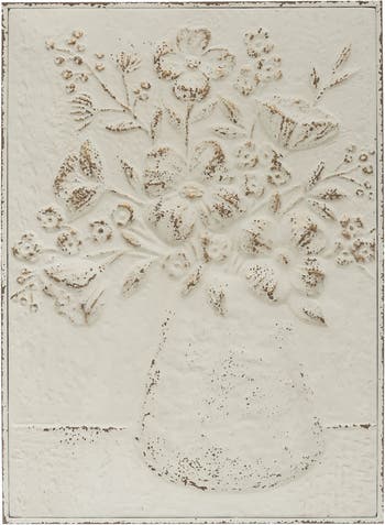 - A metal wall art that displays a vase of colorful flowers with an embossed texture and a distressed white finish with a hint of gold