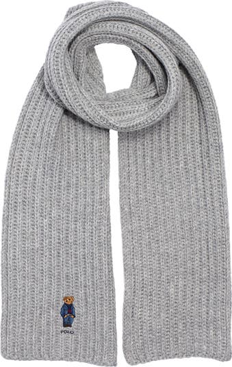 The label s dapper bear dons denim on this sweeping scarf knit from a wool-forward blend.