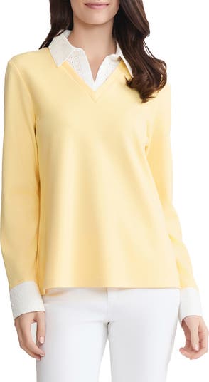 Brighten your day with this sunny long-sleeve top framed by an embroidered-eyelet collar and cuffs for a dose of added charm.
