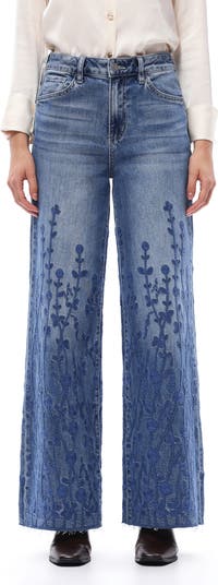 Intricate floral embroidery amplifies the boho vibes on these wide-leg jeans cut from low-stretch denim so you can roam the festival circuit in stylish comfort.
