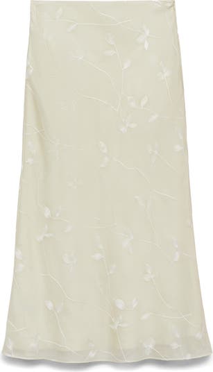 Vine embroidery cascades around the seer overlay of an elegant midi skirt with a timeless A-line silhouette.