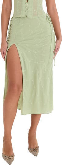A daring side slit emboldens this georgette midi skirt designed with swirling floral embroidery.