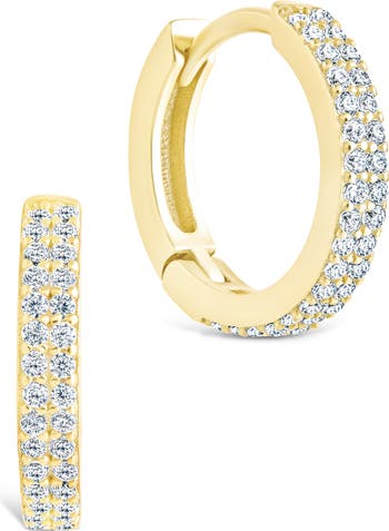 Dual rows of pavé cubic zirconia stones shimmer on hoop earrings crafted in polished sterling silver or 14-karat gold plate.