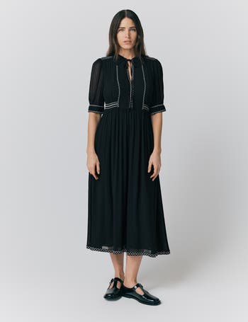 Perfect for any occasion, the Emma Dress highlights elegance with a touch of bohemian charm, offering versatility with its embroidered detailing and self-tie neckline.