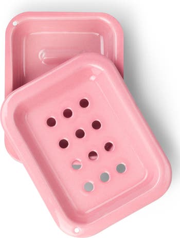 A stylish addition to your countertop, this soap dish features a holed upper section that keeps soap dry and a base that catches drips and makes cleaning easy. This two-part design is handmade with a ceramic-style glazed coating fired onto durable metal.