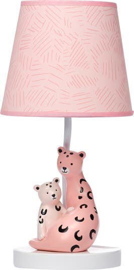 Add a soft glow to your child’s room with this custom mommy and baby leopard lamp. This 3-dimensional hand-painted resin lamp with shade is approximately 14” in total height. The lamp shade is a pink print pattern with solid pink trim. Included is an energy efficient light bulb equivalent to 60 watts.