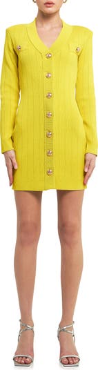 Shiny golden buttons pop on this ribbed sweater-dress cut to skim your curves and finished with a commanding shoulder silhouette.