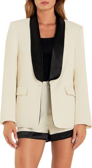 A creamy hue switches up the look for a tuxedo-inspired jacket fixed with lustrous satin lapels.