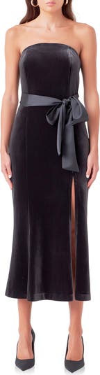 A sleek satin tie tethers the waist of this rich velvet midi dress cut with a sleek strapless neckline and a thigh-high slit at the hem.