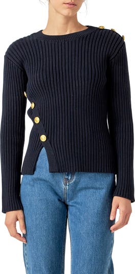 Soft ribbing shapes this close-fitting sweater elevated with golden buttons and an airy side vent.
