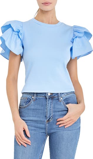 Buoyant layered ruffles make their presence known on a trim top cut from narrow ribbing.