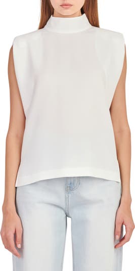 Padded shoulders frame this sleeveless top designed with a sophisticated mock neck.