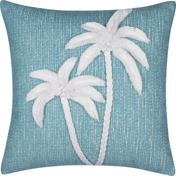 This artisinal pillow features hand-created three-dimensional palm trees with braided trunks, hand knotted coconuts and fringed palm fronds to complete the look.