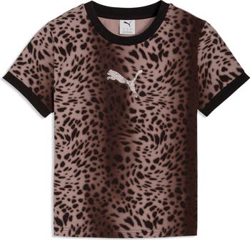 A sparkling rhinestone logo centers a slim, stretch-added cotton jersey T-shirt printed with leopard spots to bring fierce glamour to any day.