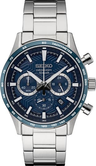 Function-packed and fashionably packaged, this Essentials chronograph lives up to its name with an eye-catching and very readable dial framed with a tachymeter bezel.