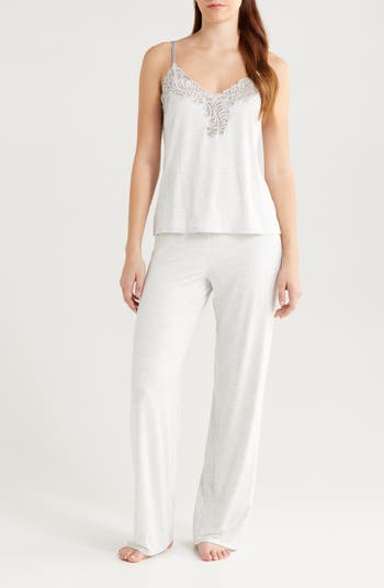 Delicate lace trim lends romantic touches to a buttery-soft jersey pajama set perfect for relaxing evenings or sweet dreaming.