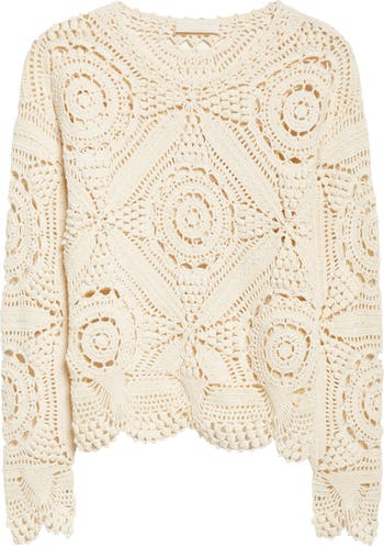 Intricate hand-crocheted cotton forms a kaleidoscopic motif on this airy top finished with a subtly see-through texture and gently scalloped hem.