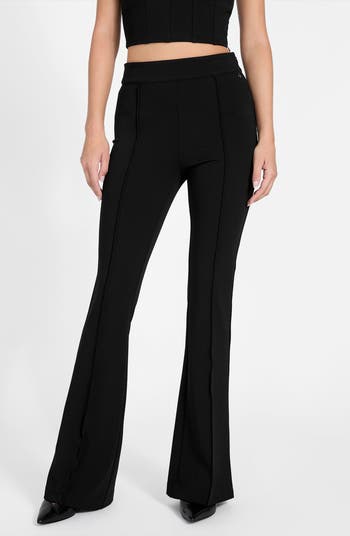 Stitched-down pleats emphasize the clean, trim-fitting lines of versatile stretch pants fashioned with flared legs for a retro look.