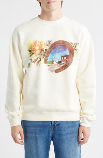 A watercolor graphic illustrates a dusty portal into the quiet joys of the west in this slouchy cotton-fleece sweatshirt.