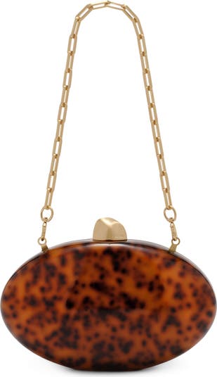 An architectural clasp gleams atop an oval-shaped clutch rendered in glossy acrylic and suspended from an optional chain strap for hands-free carry.