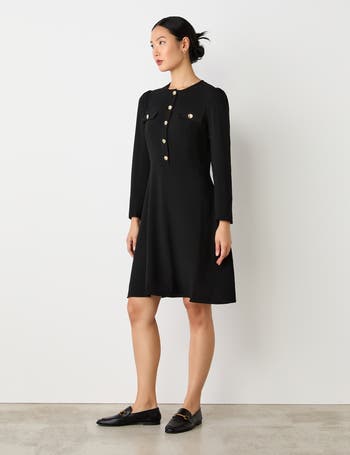 Crafted from our signature crepe, Evie is a classic knee length dress with a round neck, gorgeous gold button detailing, fitted bodice and long sleeves. Pair with tights and knee high boots for a chic ensemble.