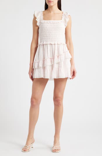 A smocked bodice shapes the silhouette of this soft cotton mini made with fluttering frills and airy eyelets for texture and movement.
