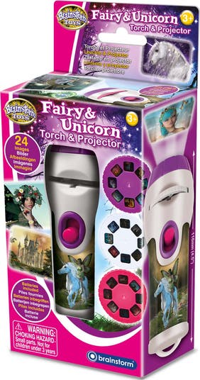 TORCH PROJECTOR: FAIRY UNICORN - Transform your room into a magical fairy land with this fantastic projector torch. Simply shine the torch around your room and view beautiful images of fairies, unicorns and their magical homes. A great bedtime companion to make going to sleep more fun. 3 DISCS WITH 24 IMAGES: The torch comes with three slide discs including 24 color fairy and unicorn photographs. Swap and change the slides easily by inserting the chosen disc then rotate the disc round to view the fantastic color images which project up to one meter wide. Images are easily focused by turning the lens head. It can also be used as a normal torch without the slides in place and is great for keeping on bedside tables to give comfort to children during the night. PERFECT SIZE: The torch measures 4.5" (12 cm) long and 1.5" (4 cm) in diameter. A perfect, fun yet educational, gift for boys and girls who are interested in fairies and unicorns. Now that kids grow out of toys earlier and earlier, torches will appeal to kids into their tween and teen years. Ideal for pajama parties and sleepovers.