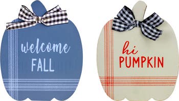 Fall Harvest Wooden "Hi Pumpkin" and "Welcome Fall" Plaques with Bow - 8" - Set of 2