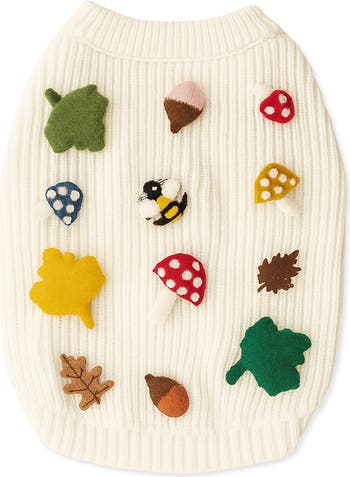 Three-dimensional appliqués of fall leaves, acorns, mushrooms and a buzzy bee dot this warm and cozy ribbed sweater your pup will love on chilly days.
