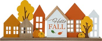 Transform your home into an autumn haven with this charming village table decor. Featuring 5 uniquely shaped houses adorned with cutout windows and holiday sentiments, this decor piece brings festive colors and a sweet spirit to any shelf or table.
