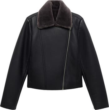 An edgy faux-leather bomber is made in a cool cropped fit and accented with fluffy faux fur.