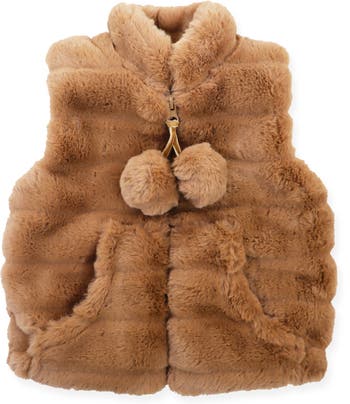 Super soft faux fur vest is the perfect layering piece. Designed with playful pompons and fully lined in faux fur.