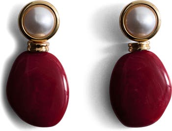 Bezel-set faux pearls bring a classic glow to these drop earrings modernized by boldly hued drops of resin.