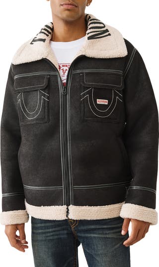 True Religion s logo and brand-signature horseshoe motifs bring heritage appeal to a faux-leather jacket neatly outlined by fluffy faux-shearling trim to warm your chilly-day ensemble.