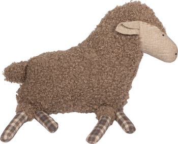 - A charming sheep-shaped pillow crafted from soft faux in a warm brown hue