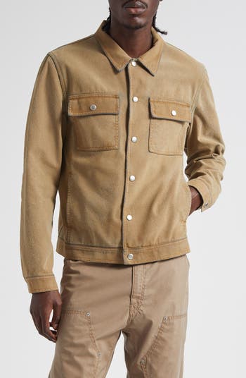 Coated denim resembles roughed-up suede on this snap-front jacket that looks inherently worn-in due to the indigo peeking through at the seams and edges.