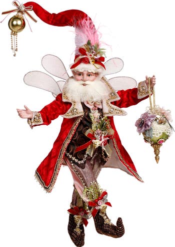A Mark Roberts Favorite Ornament Fairy holding an ornament is a whimsical collectible brimming with holiday sparkle and storybook charm. Dressed in richly layered fabrics with intricate trim, she cradles a beautifully detailed ornament as if presenting a treasured gift from her enchanted world. With her delicate wings, expressive face, and signature Mark Roberts artistry, she adds a magical, heirloom-quality touch to any Christmas tree or festive display.
