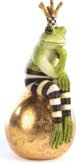 Whimsical yet sophisticated, this frog figurine stands out with its striking, hand-painted stripes and gleaming gold-leaf ball.