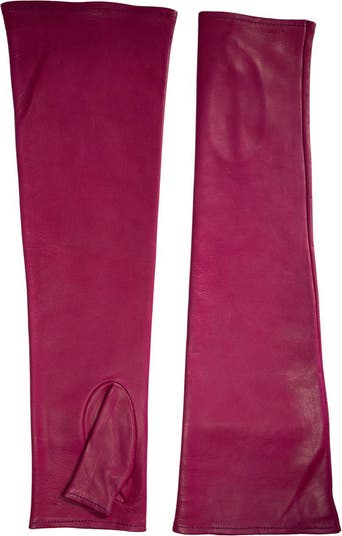 Supple leather fingerless gloves deliver sleek warmth in an elbow-length silhouette that keeps dexterity front and center. A smooth silk lining adds a refined finish that feels luxuriously soft against the skin.