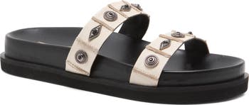 Mixed medallions enrich the distressed leather straps on a boho-cool slide sandal featuring a contoured footbed and durable rubber sole.