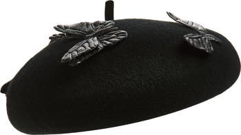 Designed for those who collect conversation pieces, this felt beret is handcrafted in NYC then accented with dimensional lambskin-leather butterflies that seem to hover with every step. The effect is all shadow play and movement.