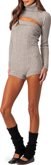 Cozy cable stitching brings warmth to this two-piece set featuring a turtleneck shrug and a strapless romper.