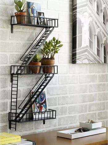 A clever wall-mounted shelf designed to resemble a fire escape, perfect for city-lovers and apartment-dwellers. Ideal for displaying houseplants, books, and more.