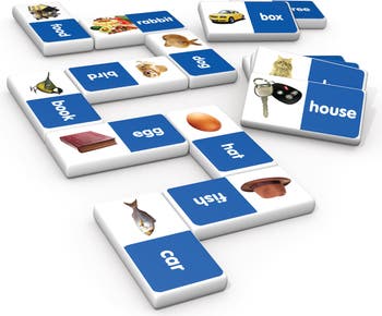 First word dominoes include a 28 piece set on thick plastic dominoes. Dominoes come in a collectors tin for storage. Children will love the feel of real dominoes as they complete the first words matching games. Teaches word building with 30 word cards. Cards use real photography, vibrant, fun images. Build loads of different words for common nouns.