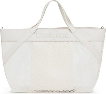 Dare to bare the contents of your bag with this fishnet-style tote boasting a superspacious silhouette and tonal topstitched logo extending across the top.