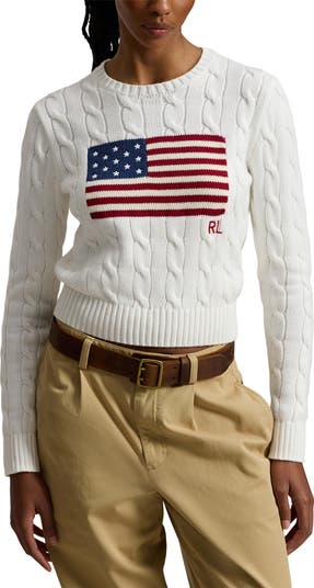 The brand s Team USA collection plays to win in an all-cotton sweater knit with traditional cabling and the Stars Stripes waving brightly across the chest. Comfortable enough to wear on its own, it layers easily when the temperatures cool and the patriotism heats up.
