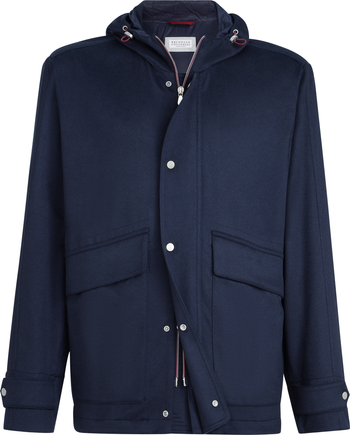 - Double closure with zip and snapsLined hood and adjustable drawstringSnaps at cuffsPatch hand pockets with flap and buttonUnlinedTwo interior pockets with button closure and pen holderDrawstring hem